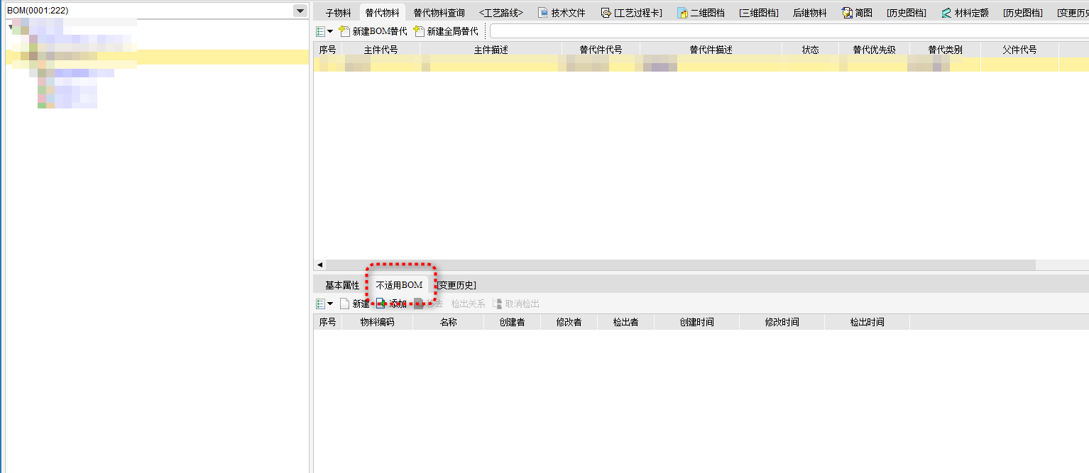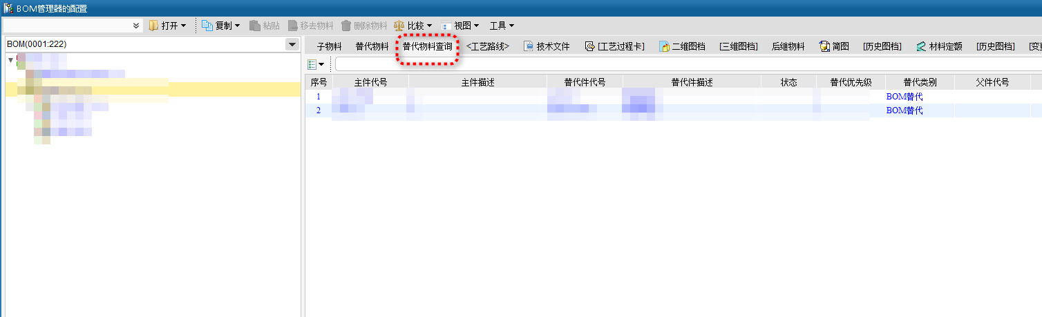Substitute Material Inquiry:The BOM Manager includes a dedicated query page titled “Substitute Material Inquiry,” which allows users to view all substitution relationships associated with a selected material.