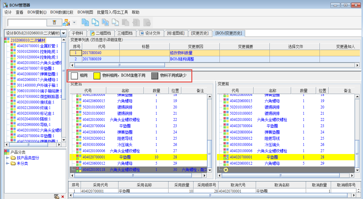 通过变更历史的查看,可以对历次的变更历史进行追溯,而且还可以看到变更前后信息的对比差异,如BOM的前后差异。