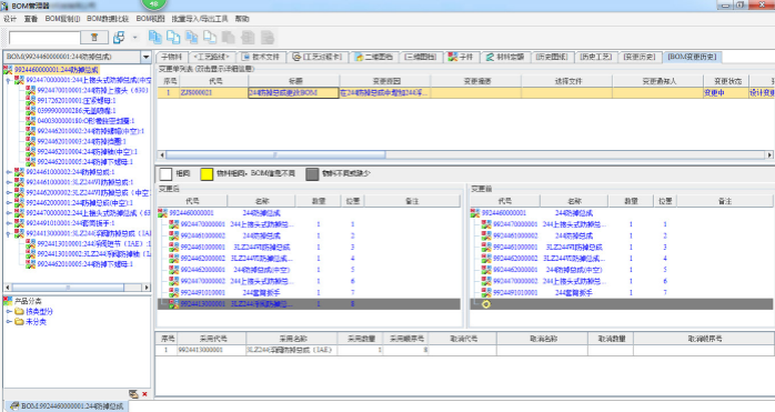 通过变更历史的查看,可以对历次的变更历史进行追溯,而且还可以看到变更前后信息的对比差异,如BOM的前后差异。