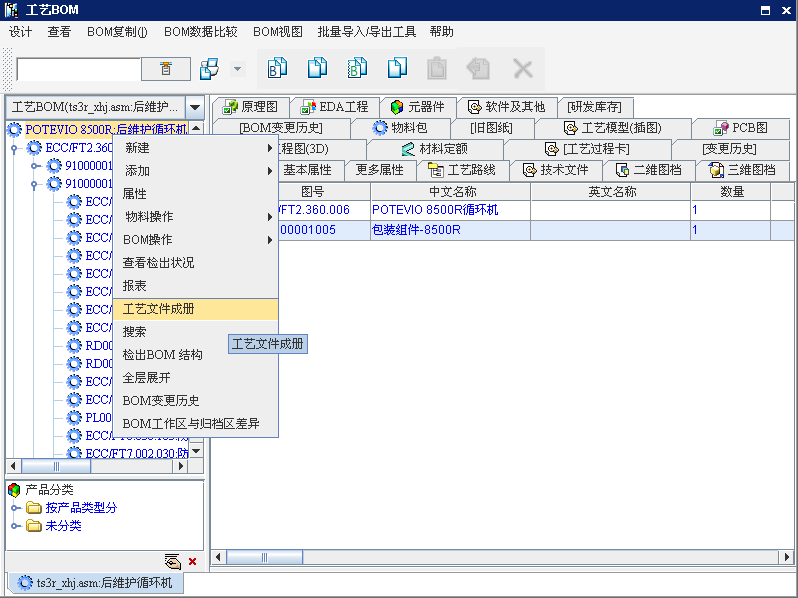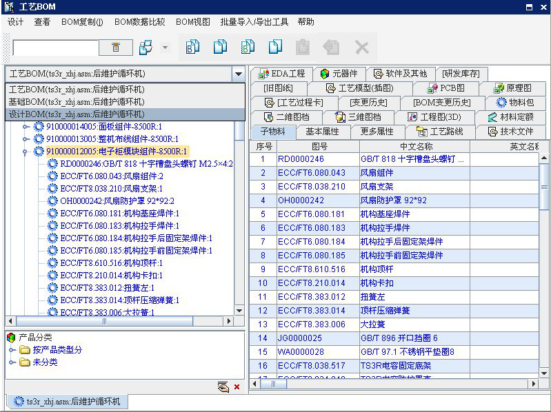 经过项目组多次研讨,确立了基础BOM->设计BOM->工艺BOM->制造BOM(ERP集成)的演化路径,并以BOM为核心管理所有的产品设计、工艺数据。实现按照基础BOM实现机械、电子CAD集成,按照设计BOM管理设计资料、按照工艺BOM管理工艺资料。