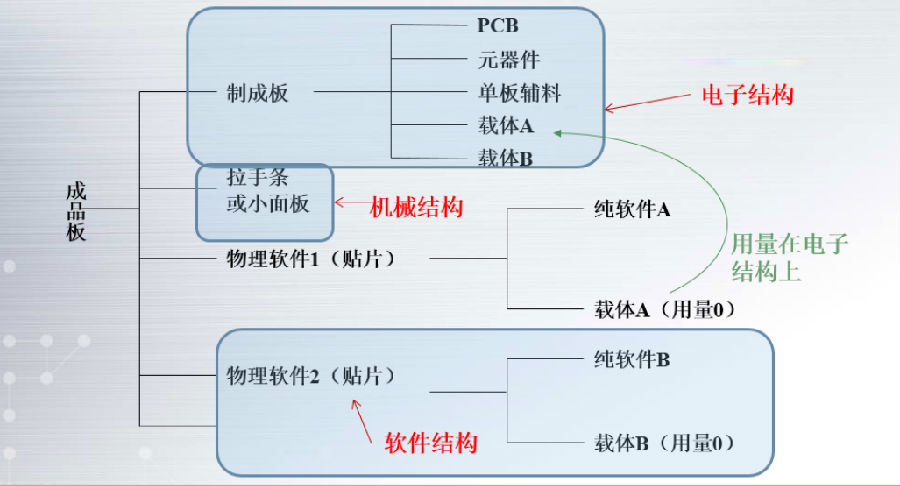 介于上海保隆公司产品管理模式,SIPM/PLM引入软件物料的概念,软件一般烧制在载体芯片(元器件)上,因此物理软件是个虚拟件,在物理软件结构下,载体用量为0,真正用量在电子设计上,这样可以完成电子设计不变情况下软件升级不影响电子设计的BOM,对于设计最为合理。同时软件作为特殊物料来进行管理,软件版本不同,软件物料的代号不同。