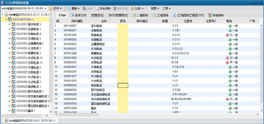 PCBA硬件BOM中元器件提供位置号对比功能,检查BOM结构中元器件位置是否出现重复,实现PCBA硬件产品BOM的BOM结构准确化、规范化。