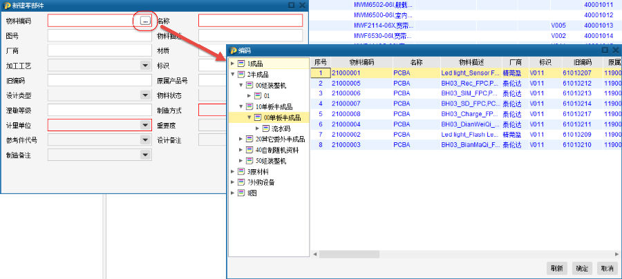 同时对零部件调用编码管理器取编码时,逐级展开零部件编码的特征段,编码管理器窗口中根据已选特征段自动查询显示归档区的零部件,方便工程师查看系统中有无相同物料和借用零部件特征属性。