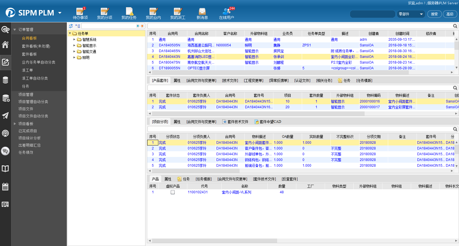 三思PLM系统接收OA传输的WBS订单数据,在PLM系统依照合同、套件、分项三层次依序呈现,由专人线上委派负责人、下达任务、成立项目,并依照计划有序完成产品设计与物料BOM工艺数据维护后,以分项为单位传输给SAP系统进行WS订单生产。