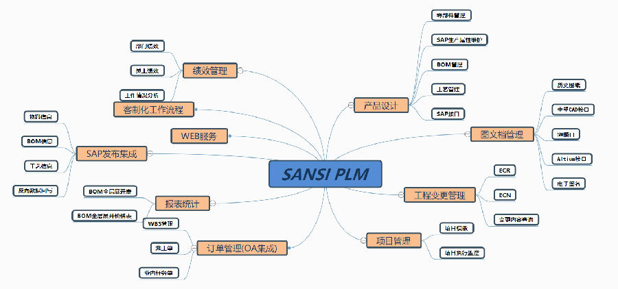 因应三思特殊的工程订单式业务,三思PLM项目透过OA、PLM、ERP三者之间的双向集成接口,打通OA接单、PLM设计、ERP生产的整体业务数据流。