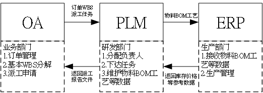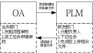 由业务部门在OA中发起派工单与业内任务单申请流程,经过审批后,将相关数据与任务书附件集成传输到PLM系统,研发人员可以直接在PLM系统中浏览相关数据与文件,并指定负责人与下达任务。