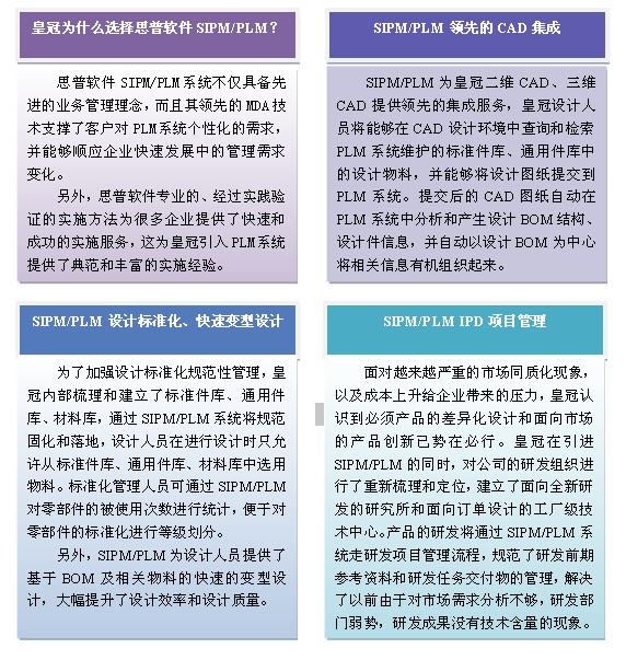 “SIPM/PLM的引进支撑了皇冠的产品战略,皇冠“让工具融于生活并改善生活”的客户价值理念因此得以落实和优化。”