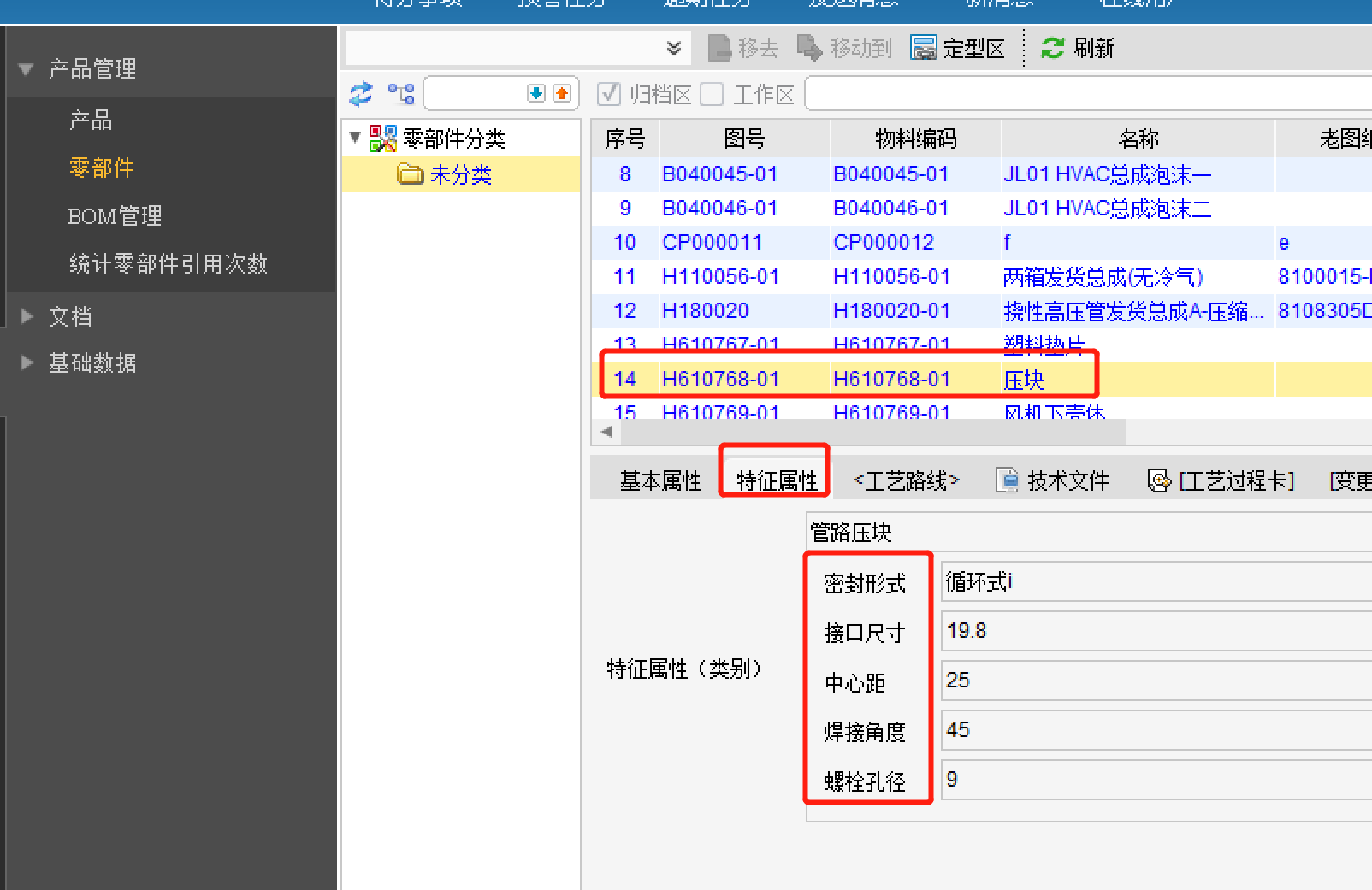 鼓风机、蒸发器、膨胀阀、温度传感器、控制面板、压缩机、管理压块、油冷机、压力开关等不同类型的物料,物料的关键属性差别大,统一的属性不能充分表达各自的特有特性。PLM系统对这类零部件设置各自的特征属性,准确描述物料,方便工程师在新设计时快速准确引用。