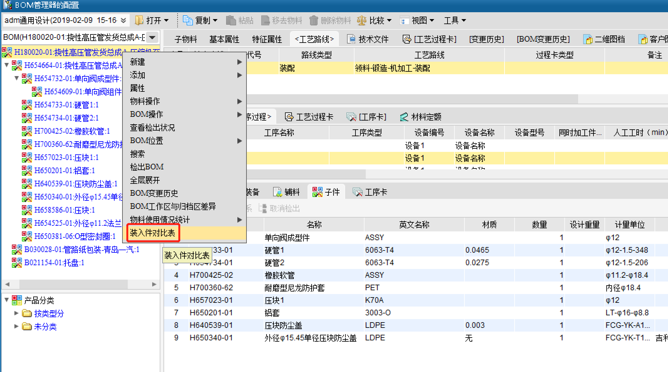 装入件对照表,方便工艺设计师快速进行装配工序的装配子件维护。