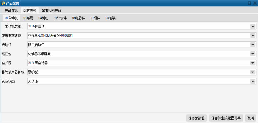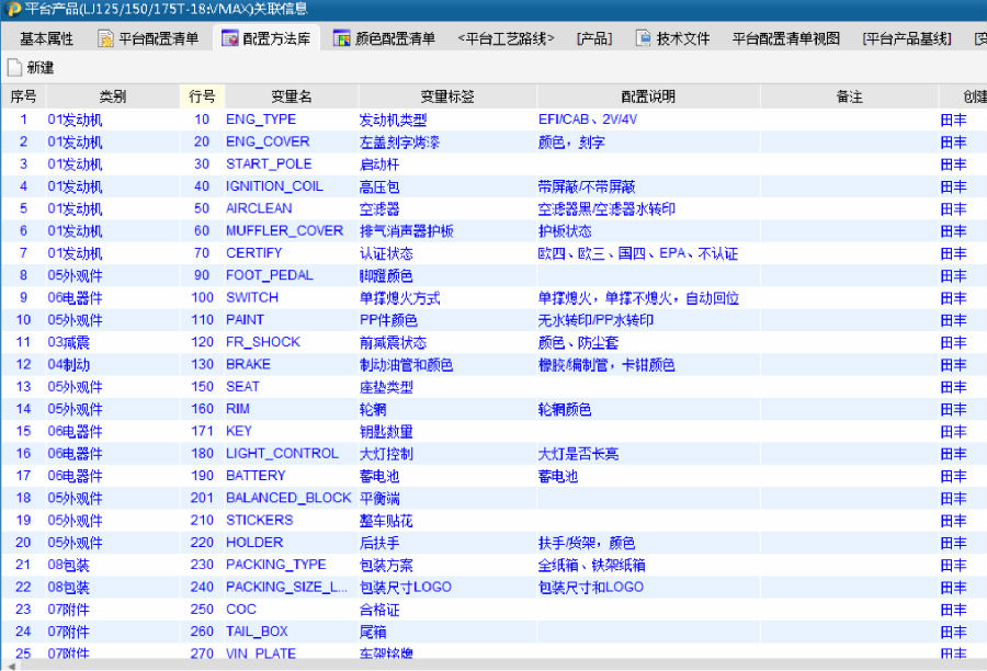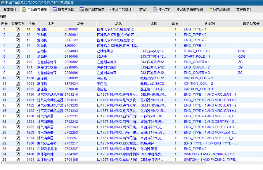 同一参数有多少选项,就有多少条配置清单。通过“选择条件”定义配置的与配置参数间的关系。如:VMAX125-175平台上,发动机有3种选择,配置清单中就有3种发动机配置清单。