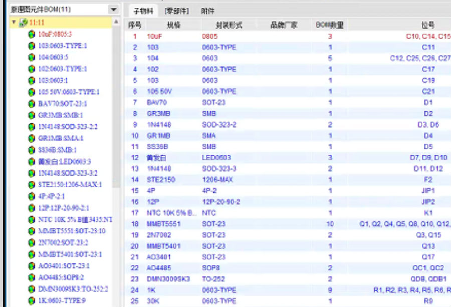 3) 电子物料与原理图通过字段“封装形式”“规格”匹配生成产品结构BOM
