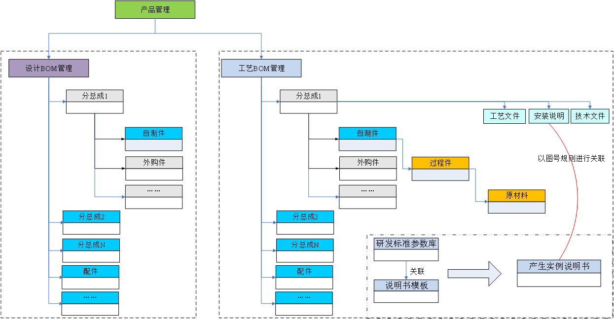 以设计BOM为基础,工艺部门在设计BOM的基础上将原材料信息及工序过程中的半成品信息进行补全,形成完整的工艺BOM及工艺文件信息。