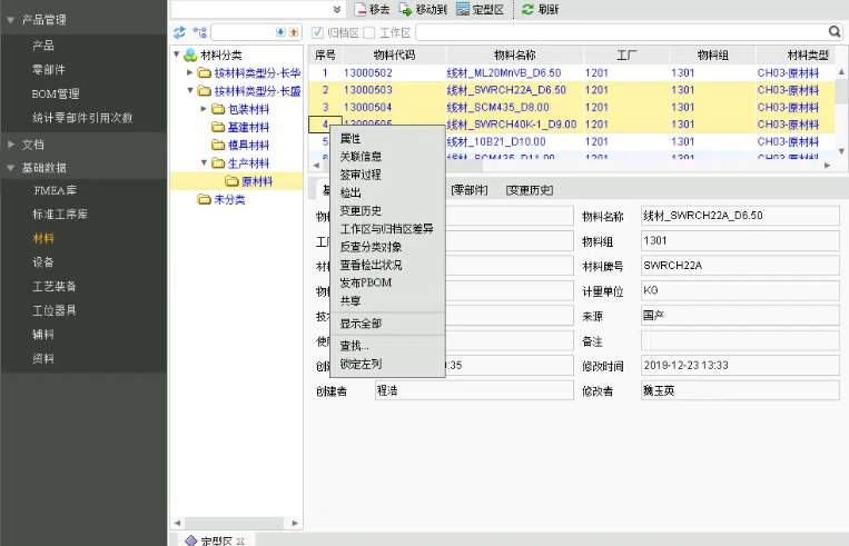 基于业务需要,浙江长华需要按长华公司、长盛公司分开管理物料,包括生产性物料及非生产性物料。为了实现对物料区分管理,PLM系统将产品、零部件、材料、工艺装备、工位器具、辅料等物料对象分别增加“工厂”属性进行标记。