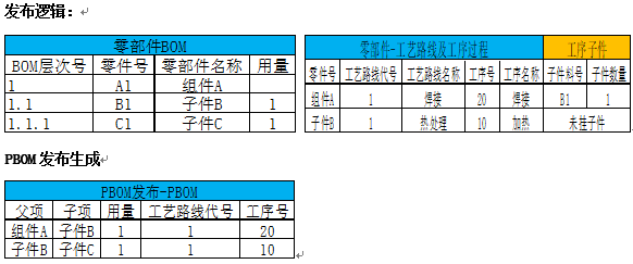 1、BOM子物料在工艺装配子件下有体现的,按子件实际对应工序及所属工艺路线生成PBOM中物料的工艺路线代号、工序代号;