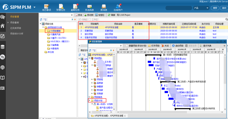 将企业APQP产品研发流程进行梳理,在SIPM/PLM系统通过项目模板进行固化。
