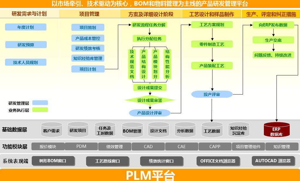 根据南通中集的业务特点和信息化规划,项目组确立了以以市场牵引、技术驱动为核心,BOM和物料管理为主线的产品研发管理平台的方针,整体流程如下图,全面实现从研发、报价、设计、工艺到ERP的数据打通。