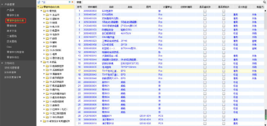 5. 按照编码规则建立规范的的零部件库分类,实现零部件的录入管控。
