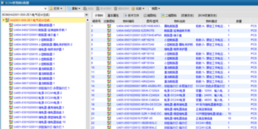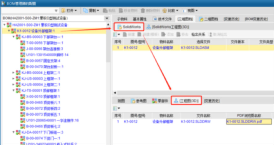 根据机械设计部门和电气设计部门的实际研发过程,分别改进原有的BOM结构,去除冗余信息,并根据设计软件与思普PLM集成的接口,将图纸与零部件及BOM有机结合起来,图纸即数据,避免人工录入数据可能产生的错误,由接口直接将设计信息导入系统,基于接口的数据一致性验证管理,保证最终录入的数据完整有效,并呈现为BOM结构展示、管理,最终实现以BOM为中心,图纸、文档、和BOM、零部件的有机关联。
