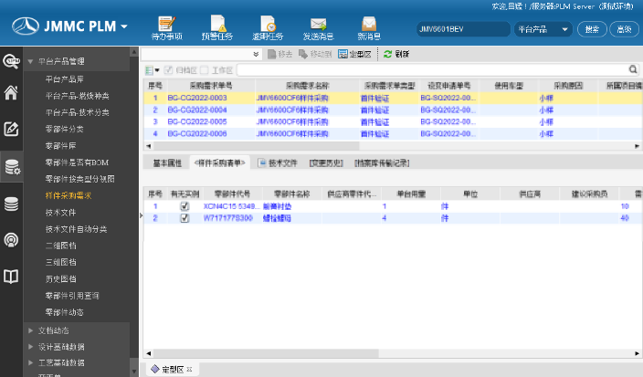针对新产品研发中的样件选型测试、产品变更的样件试验,在PLM中设置样件采购需要,由技术端直接发起申请并传输至采购。