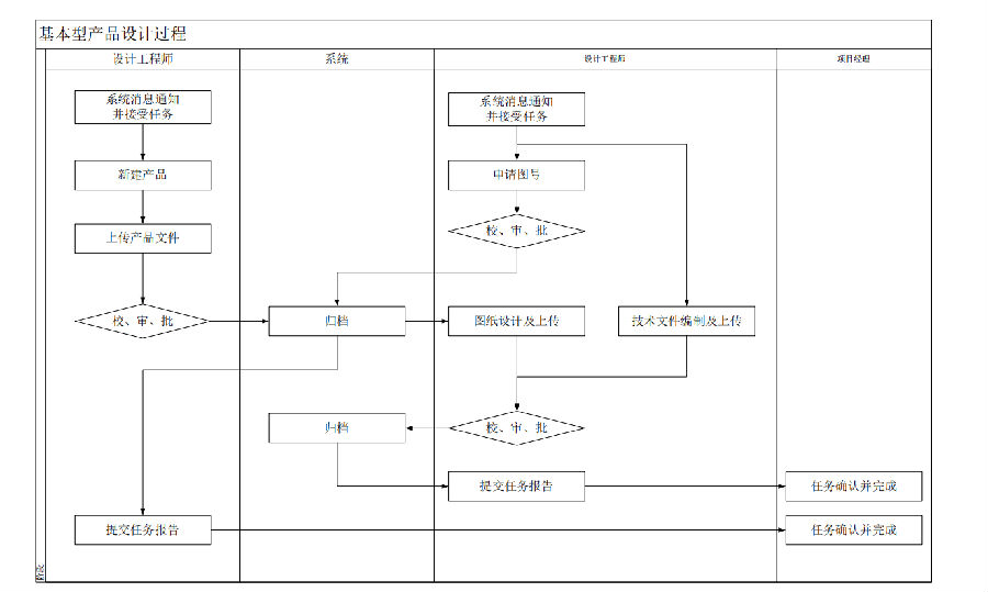 将产品设计和变更过程通过任务管理进行串联管理,通过任务时间对任务进度进行把控,通过任务输出关联文档模板达到对文件格式的把控,通过要求任务确认过程确保任务输出的完整性;输出过签审流程保证其正确性与有效性。
