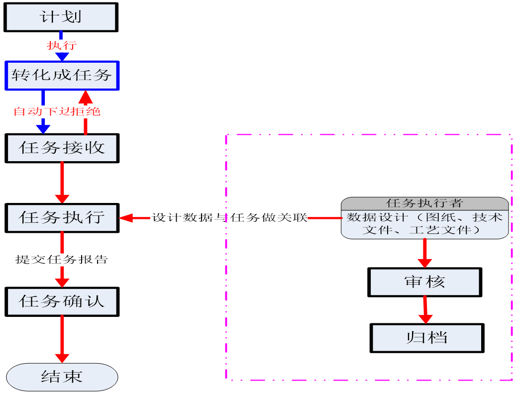 将产品设计和变更过程通过任务管理进行串联管理,通过任务时间对任务进度进行把控,通过任务输出关联文档模板达到对文件格式的把控,通过要求任务确认过程确保任务输出的完整性;输出过签审流程保证其正确性与有效性。