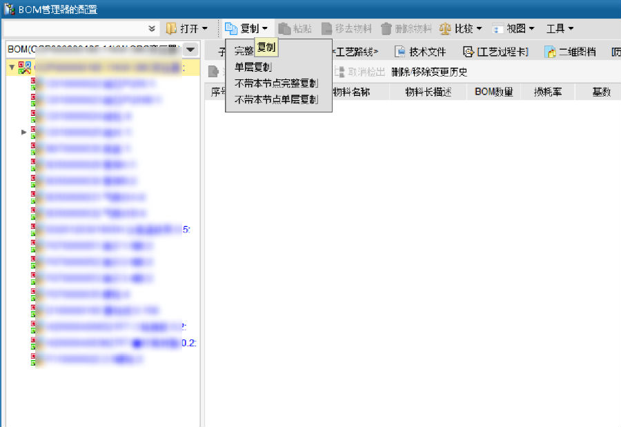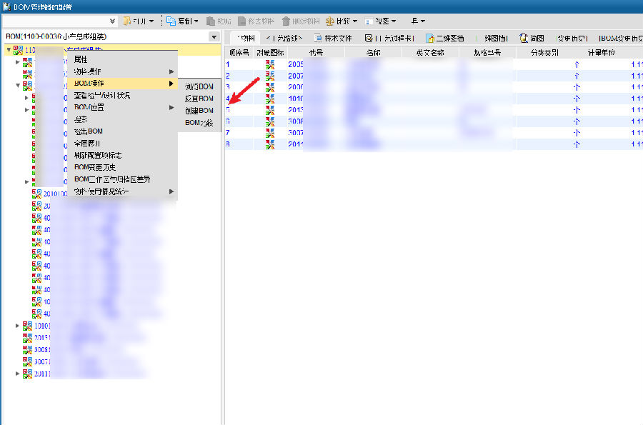 5) 提供灵活的手段支持对BOM的快速维护,在BOM结构树上能够新建、添加零部件,调整零部件位置,同时直接定义零部件信息。也可以通过复制/粘贴的方式参考其他BOM的结构进行修改生成新的BOM结构;