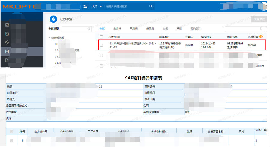 PLM申请料号后,一键传输OA进行审核,提高作业效率。