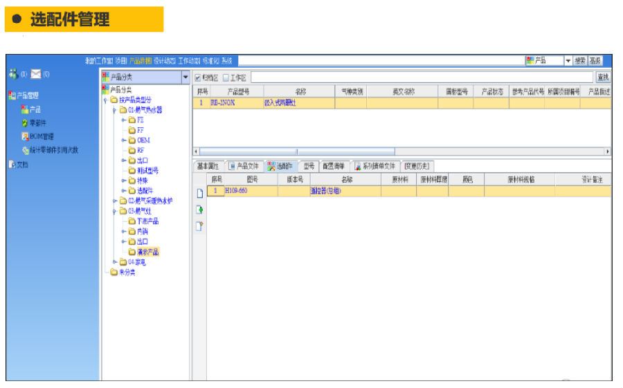 与产品做关联,以选配件管理的方式进行管控,销售人员可通过订单选择该系列产品范围内的选配件进行管理。