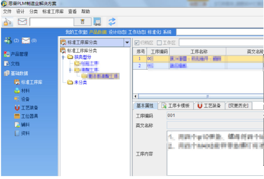 为支撑工艺设计管理的标准化及规范化,实现工艺设计结构化管理的需求,PLM中根据工艺设计的需求建立规范标准的库,如标准工序库、材料库、设备库、工艺装备库、辅料库、工位器具库等,将工艺基础数据进行固化,形成有效的知识积累,为工艺设计提供有效的数据源,提升工艺设计的规范化、标准化。