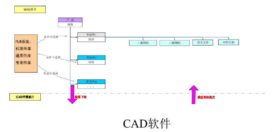 通过设计软件与PLM系统接口程序,形成CAD工具驱动BOM的管理,实现图纸线上管理,保证图纸版本的唯一性;通过软件接口将零部件、BOM及图档形成整体,图纸变更后驱动对应的BOM及零部件的修改。