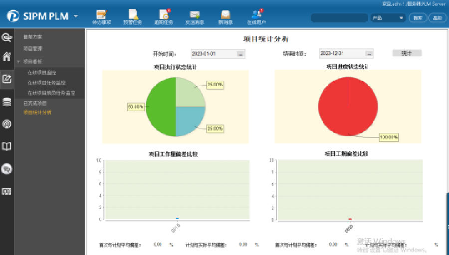 4、 项目模块通过多维度统计项目执行状态、项目工期偏差等数据信息,并通过饼状图、折线图、柱状图进性展示。