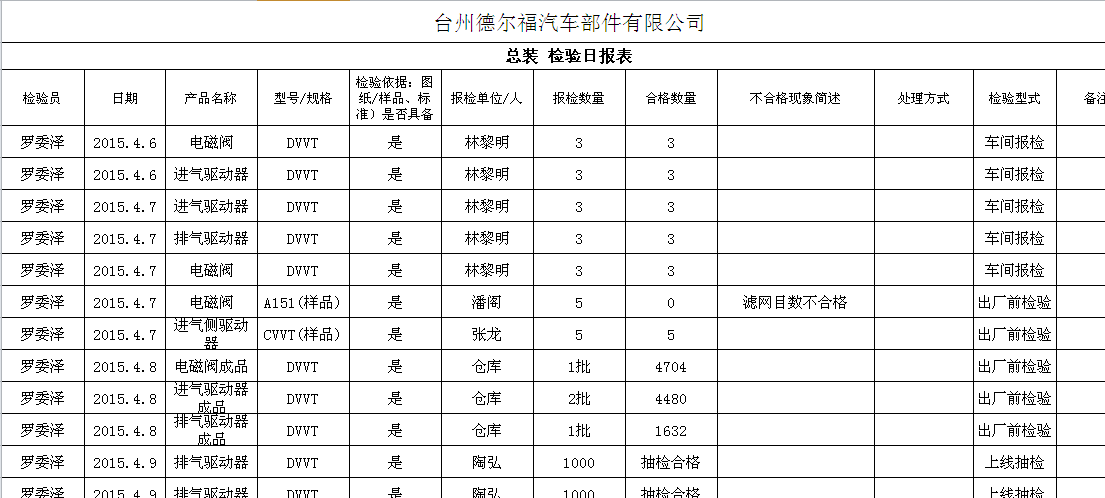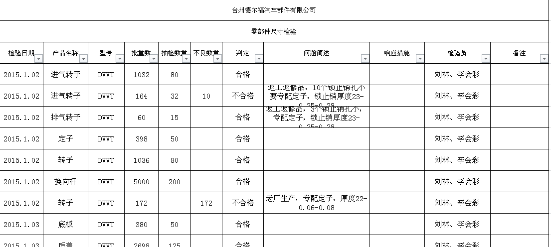 2)自制品过程检验数据由检验员汇总到质量管理部门,文员每天及时将数据录入系统用于后续统计处理分析;