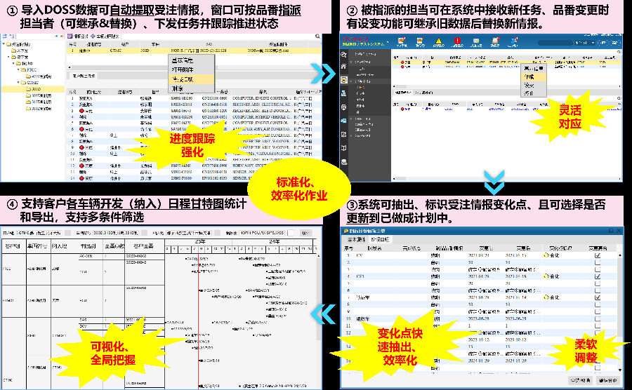 受注情报及变化点的自动抽取,并形成整体车辆日程甘特图的可视化管理,确保日程精度的同时,大大降低了人工统计处理的难度,管理者可根据各品番的社内推进状态跟踪进度。