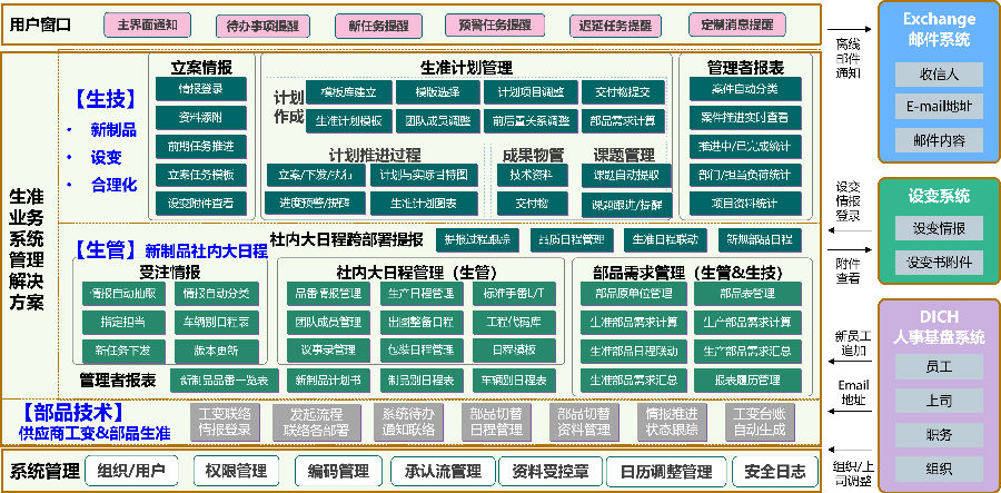 生准系统主要围绕DMNS生准业务的3条业务主线:社内大日程&生准计划&供应商工变,以及4大业务场景:新制品&设变&合理化改善&供应商工变,进行了业务蓝图的梳理和改善,深度结合DMNS实际业务场景,以减少人工作业浪费为目标,构建形成符合业务操作和管理要求的生准系统功能模块,并与人事基盘、设变系统实施了联动。