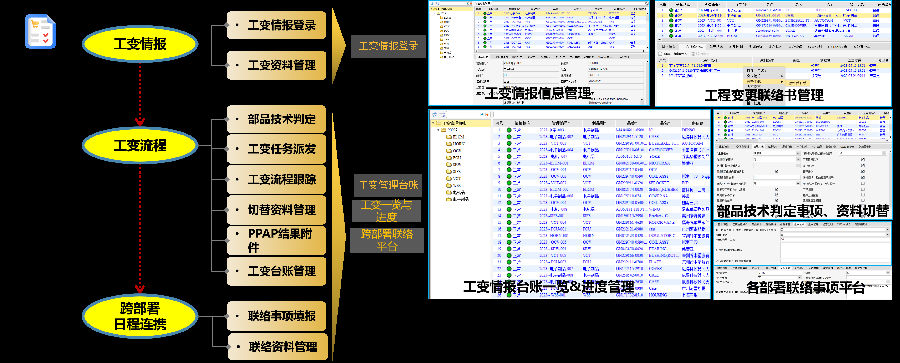 基于SIPM/PLM系统构筑生准计划管理平台,实现了新制品、设变、合理化改善等生准业务管理过程标准化,包括: