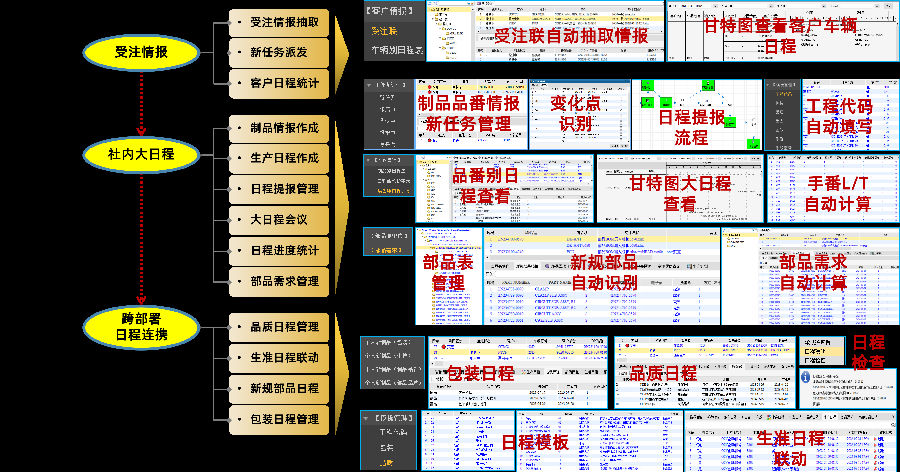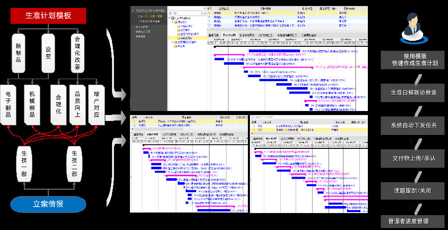 l 连携生管、生技、品保等相关部门展开新制品社内大日程线上协同管理及业务联动,包括: