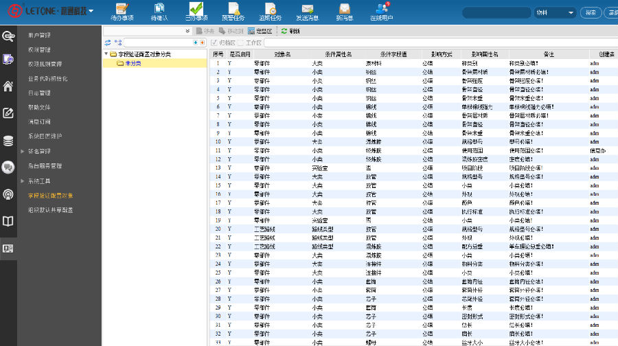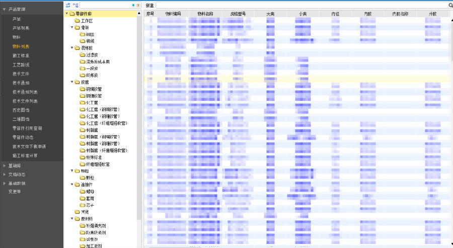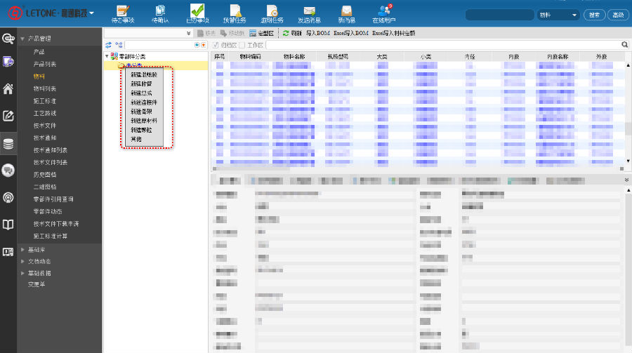 物料(零部件)管理: 针对利通产品,不同的类型的物料,根据物料的大类不同,划分不同的物料属性,通过不同的按钮,新建不同的物料。通过字段验证配置器,根据不同的条件属性名,设置不同的必填项,提高物料的规范管理。