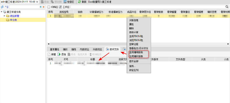 施工标准报表生成:施工标准在结构化数据构建完之后,可以右键施工标准表头-生成编织/缠绕报表,生成对应的技术文件,存放到施工标准关联的技术文件页下。一个施工标准下只允许有一份报表,如果重新点生成报表的话,会将之前的文件删除,并生成一份新的报表。