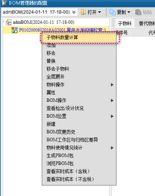 液压胶管BOM管理:液压胶管BOM,系统中管理的为1m的BOM,BOM可以一键生成,计算前提:骨架层的材质相同,编织不跟缠绕混合用。特殊情况,手动计算。在BOM管理器中,BOM头右键-BOM子物料数量计算,会通过物料上选择的施工标准中的参数,及胶管物料上内外胶两个属性选择的物料,将对应内外胶和施工标准中的钢丝一键添加到BOM结构中,并计算数量,如果需要添加中胶,手动添加中胶,重新点子物料数量计算,会计算中胶的数量。对于不满足前提的胶管物料,手搭BOM。