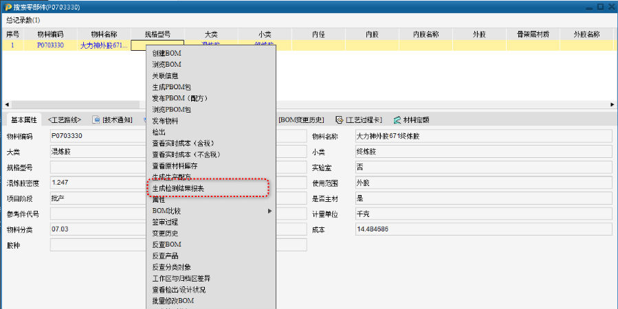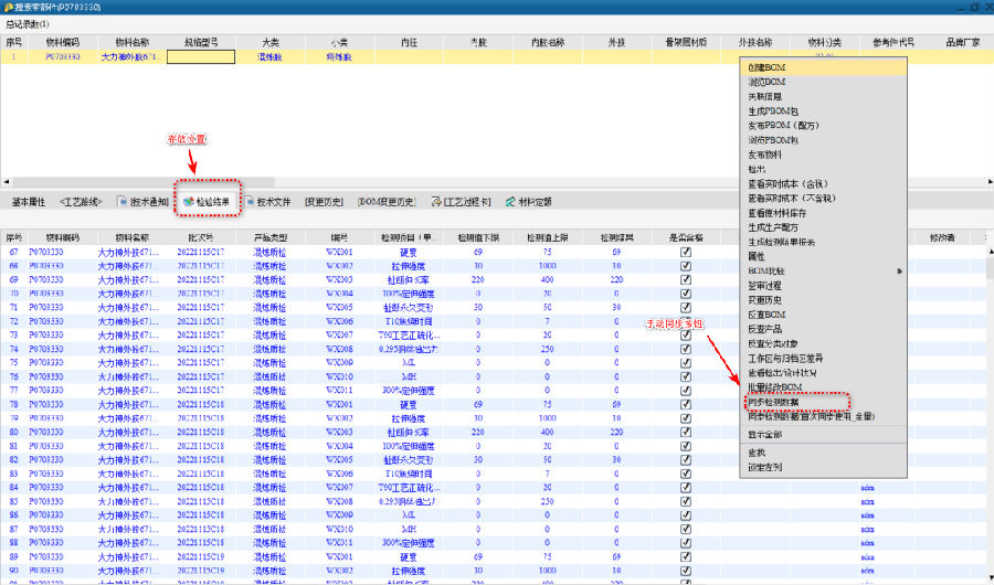 混炼胶的检测数据,为MES从检测设备中采集的,PLM直接从MES中同步,每天晚上11点自动同步,可手动同步。同步的数据,自动存放到对应的物料下。