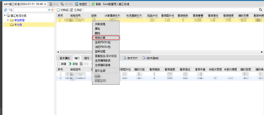 施工标准自动计算:内置计算公式,输入好必填的参数后,通过施工标准右键-参数计算,计算出行程、密度、定长、爆破压力几个参数。计算后,会将四个关联页中的数据,同步到施工标准表头上。施工标准计算的前提条件:骨架层的材质相同,编织不跟缠绕混合用。内管下浮时,增加施工标准。特殊情况,手动计算。