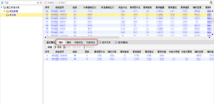 施工标准管理:施工标准,简单来说,是液压胶管的规格型号,定义了液压胶管的各种规格尺寸及骨架信息。通过施工标准表头关联四个关联页:编织、缠绕、内胶挤出、外胶挤出,编织和缠绕可以有多层,对应编织管和缠绕管,内胶挤出和外胶挤出只能有一条数据。施工标准的规格型号,需要与胶管物料上的规格型号保持一致,便于胶管BOM的数量计算。施工标准单独发布PBOM,施工标准右键发布PBOM,会将施工标准同步到MES库中。