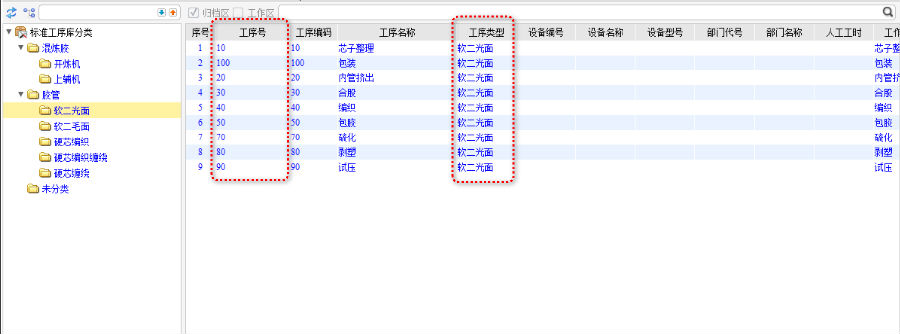 胶管工序管理:胶管工序增加工序号和工序类型两个字段,将不同车间的工序区分开。方便在制造工序中选择设备。