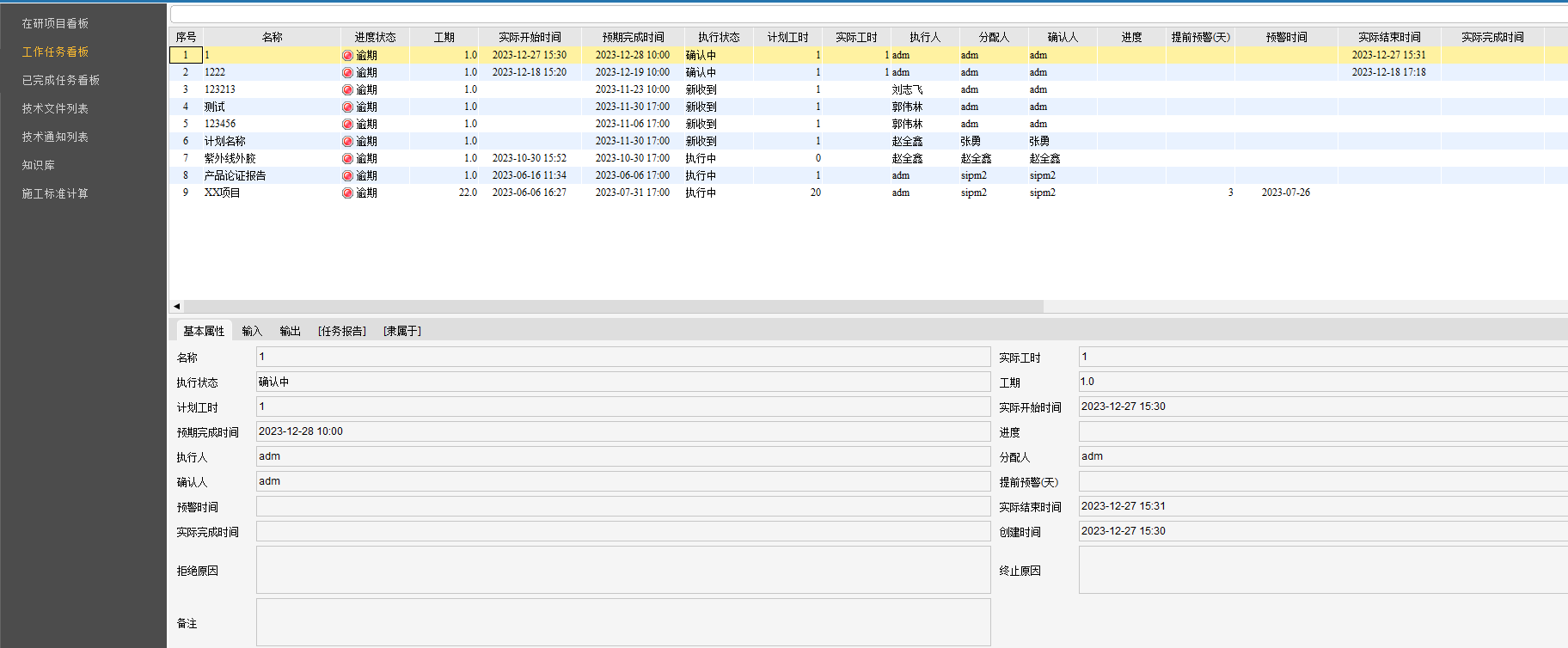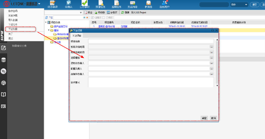 项目下达:通过点击左上角logo,下达项目,在弹出的界面中,输入项目的一些主要信息,根据填写的信息,自动生成一个项目,生成后,在个人的工作区,可以修改。流水号自动生成,项目名称对应生产的项目的名称,根据预期开始和预期完成时间自动缩放项目,根据模板,自动复制出来一个模板,根据三个负责人,去替换项目中对应的执行人,将技术要求对应项目备注。