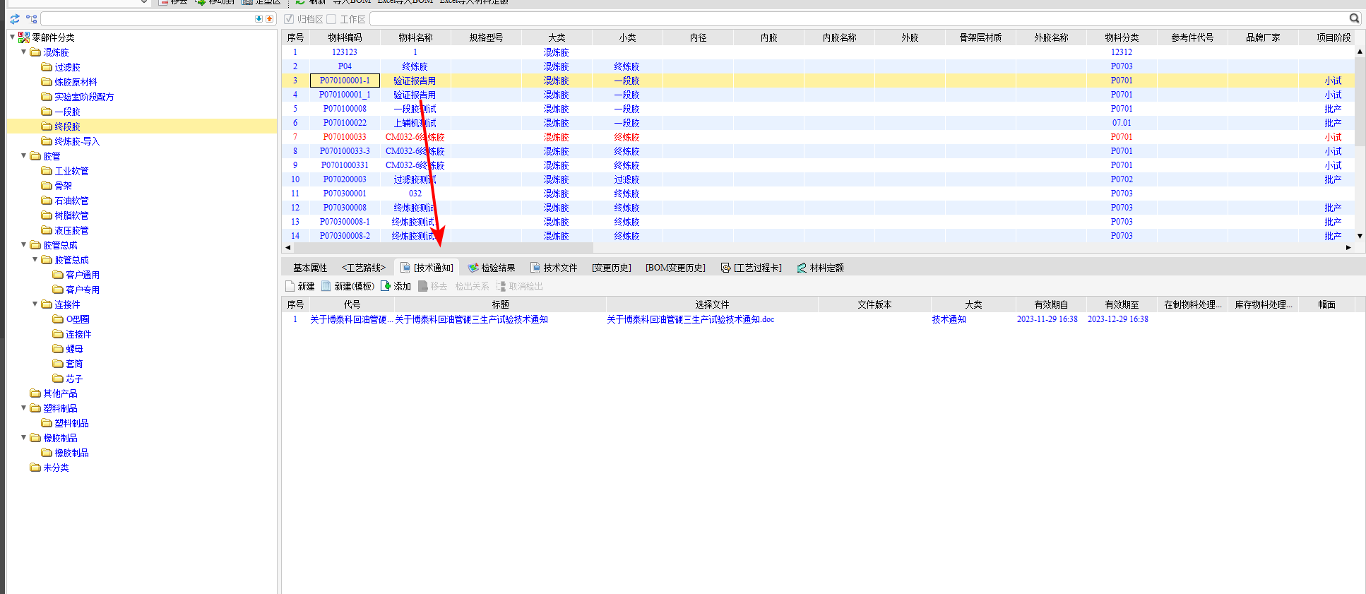 技术通知管理:技术通知是技术知道车间生产的主要文件,在系统中,新增对象,技术通知,关联到零部件下,必须在零部件的关联页中上传文件。技术通知的审批,通过大类,技术通知或评审通知,进行不同的签审流程。且文件属性有有效期,选择日期。