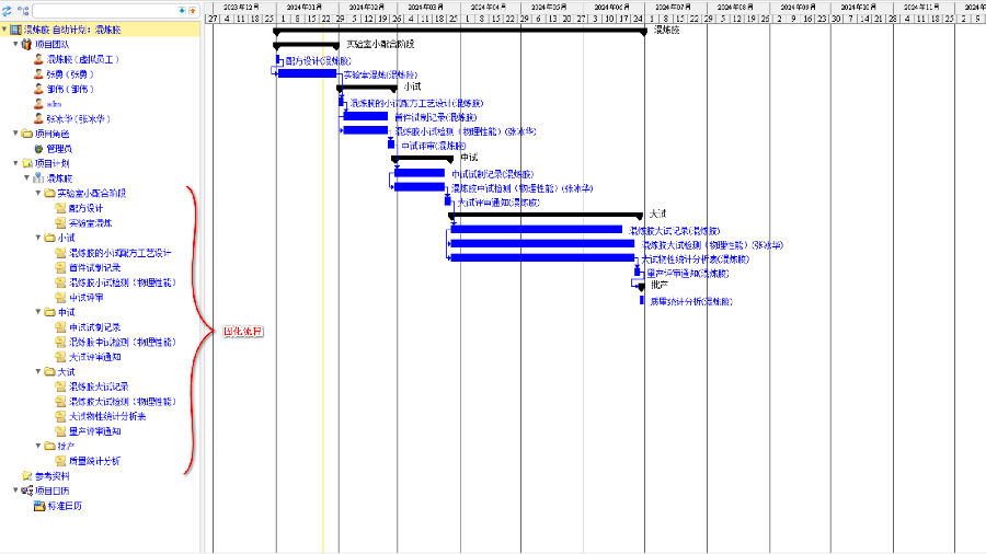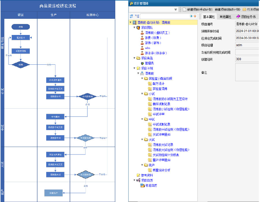 混炼胶新产品研发,经过五个阶段:实验室、小试、中试、大试,批产。将每一个阶段的数据存放到项目下。小试、中试、大试,不合格,都会重新返回到实验室阶段。经过评审,也有可能会跳过中间某一阶段。前置计划完成,后置计划自动启动。