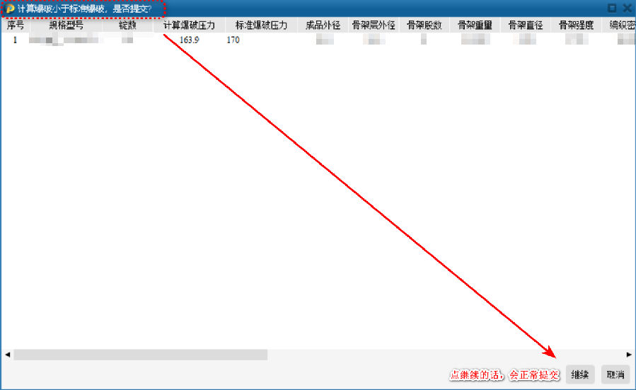 施工标准防呆:设置有判断,提交时,如果计算爆破压力小于标准爆破压力,会提示:计算爆破压力小于标准爆破压力,但是如果确认无误的话,点击继续依旧可以提交。