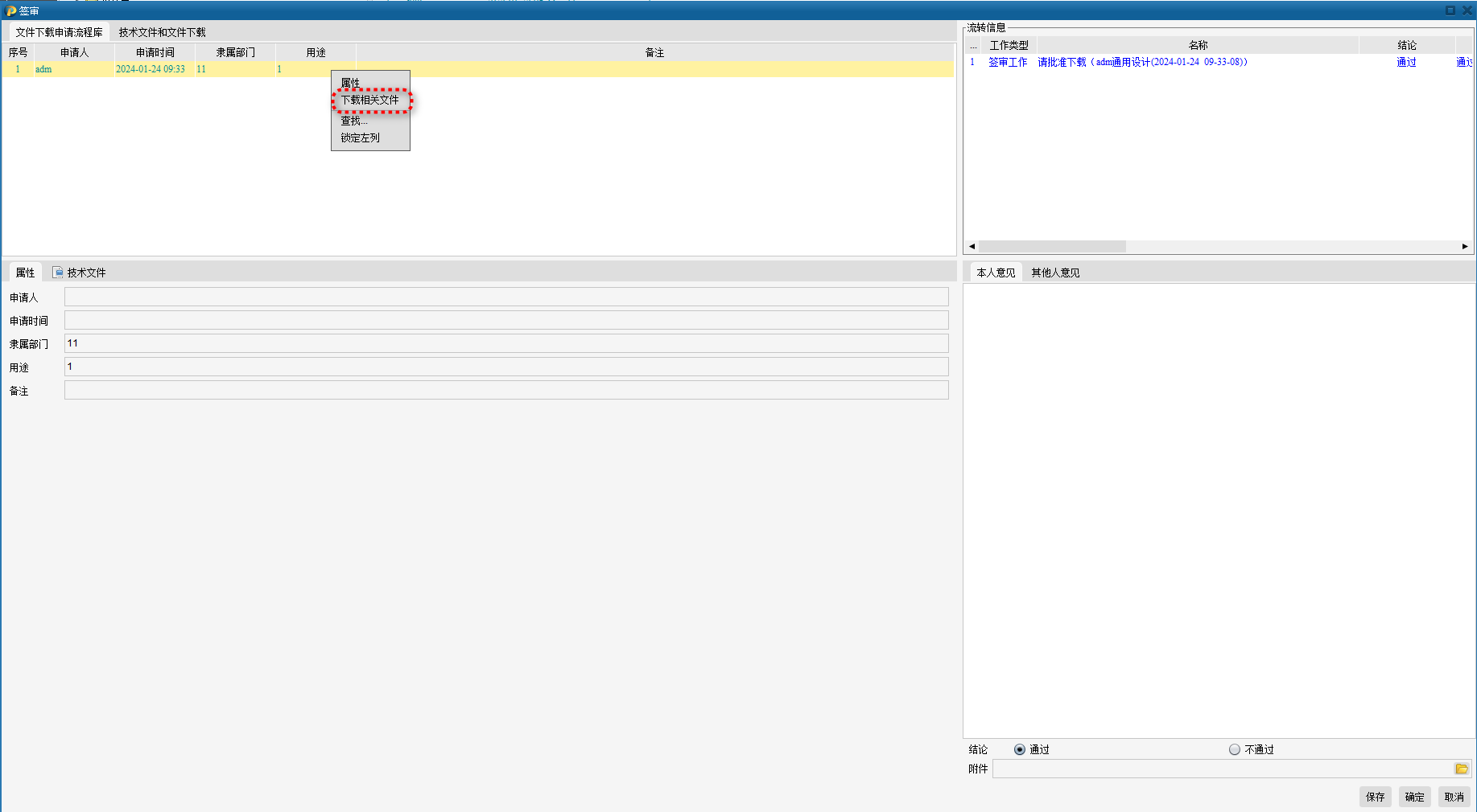 审批完成后,申请人收到一条代办事项。点开签审后,在签审的界面,右键下载相关文件,可以下载申请的文件。流程签审完毕后,相关文件变成无权限。