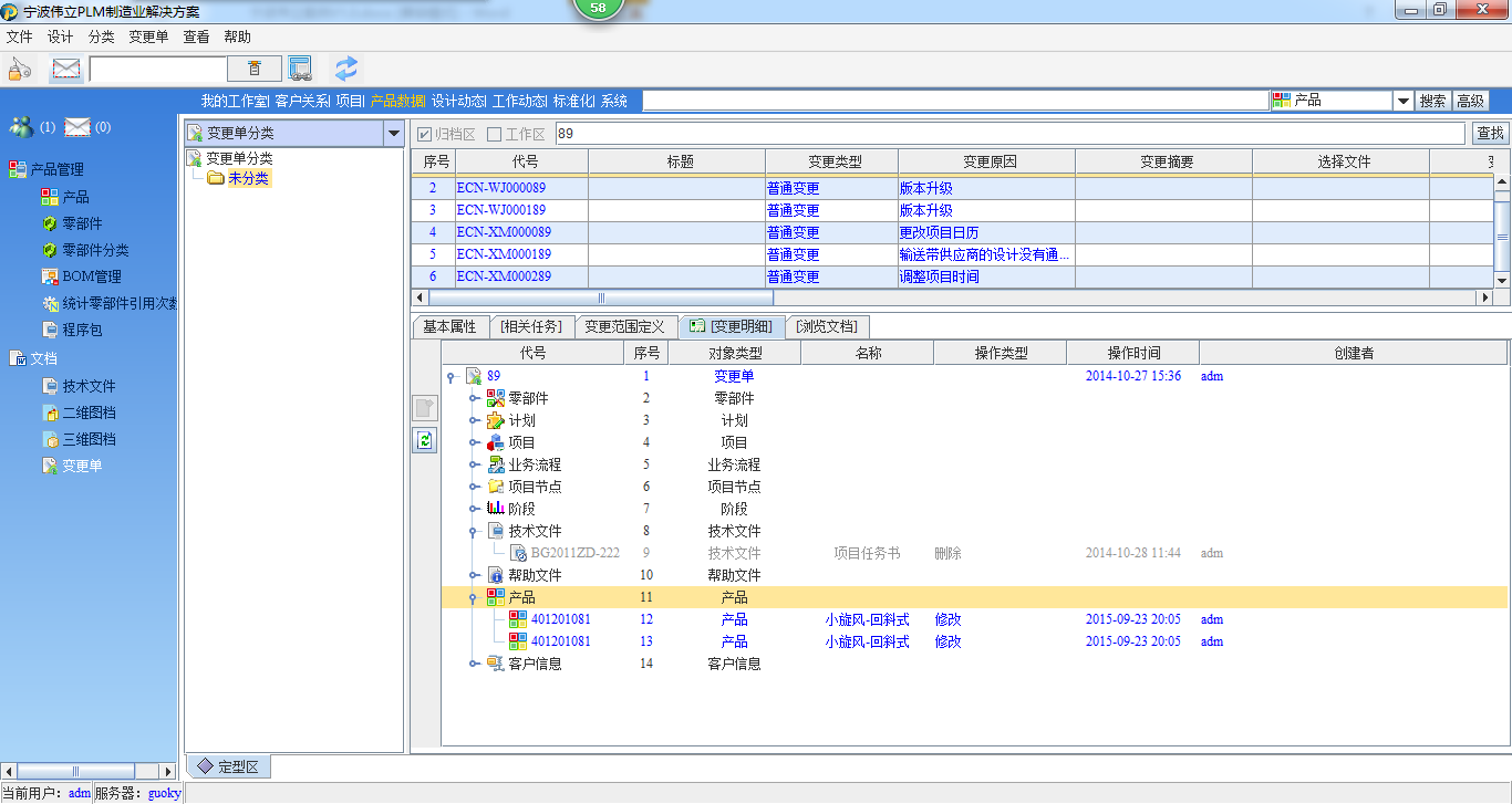 从产品设计完成、图纸及技术资料入库开始,工程更改就贯穿产品生命周期的全过程。在PLM系统中创建变更单选择更改类型并在变更范围中指定需要修改的对象(图纸、BOM等)等,修改完成后依规定的流程执行校审批,归档发布后关闭变更单。