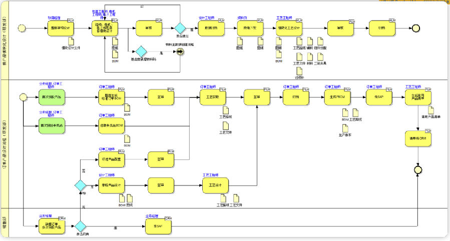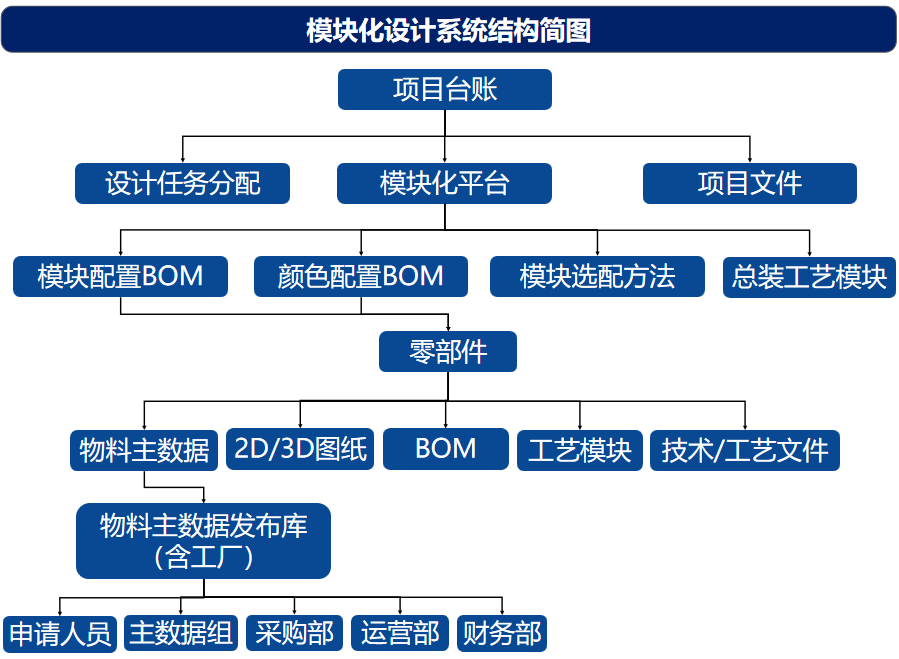 两条主线:一条以平台化产品设计为主线,完成平台开发设计、订单配置、图纸、工艺、制造设计,实现从研发至生产的端到端业务流程;